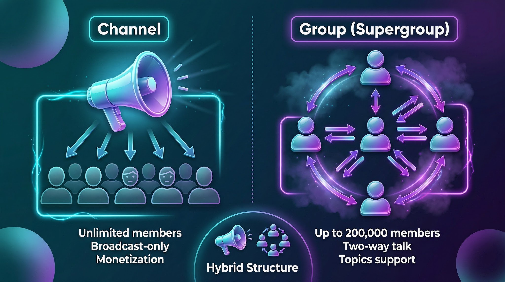 Many successful communities run both in tandem: a channel for broadcasts and a linked group for discussion. This hybrid structure is the recommended architecture once you scale past 1,000 members.