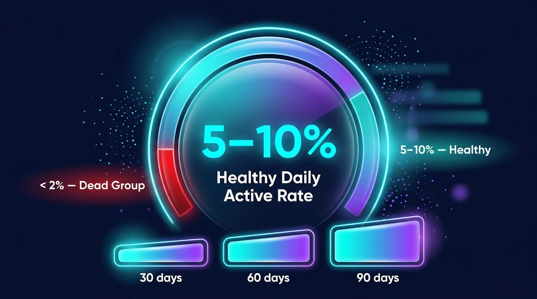 Vanity metrics like total member count tell you almost nothing on their own. For groups with 500+ members, a 5 to 10% daily active rate is healthy. Below 2% signals an effectively dead group.